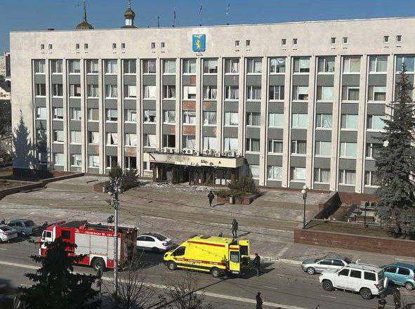 БПЛА врезался во входную группу здания городской администрации, расположенное в центре областной столицы. Посечены окна и фасад здания.