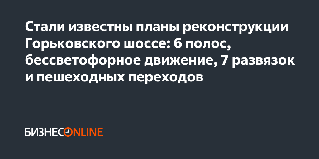 Стали известны предварительные планы реконструкции Горьковского шоссе. Предпроектные предложения включают в себя 7 новых развязок в разных уровнях, столько же надземных и подземных пешеходных переходов, а также расширение трассы под железнодорожным путепроводом близ Лебяжьего.