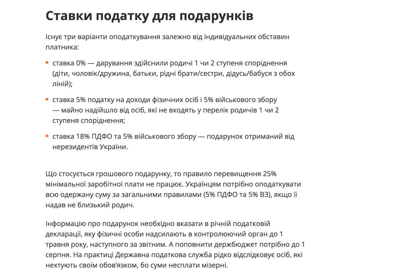 От налога освобождены только родственники первой линии. Второй линии - должны заплатить по 5 процентов на ВСУ и 5 в бюджет. Остальные должны платить полностью - информацию о подарке и его стоимости нужно указать в годовой налоговой декларации.