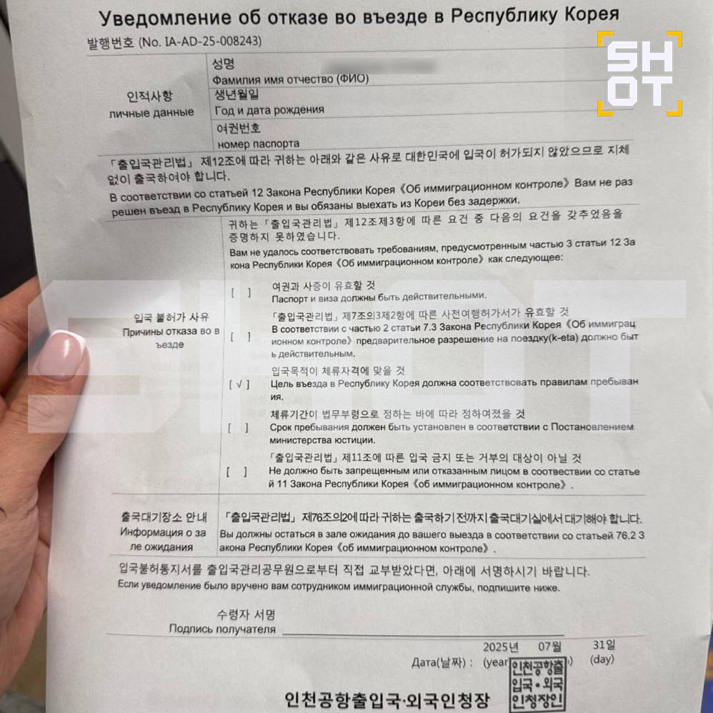 После этого девушке выдали документ, что ей отказано во въезде в Южную Корею без объяснения причин, и поместили в подвал аэропорта, где находилось ещё 9 таких же «счастливчиков». Спали на стульях. В итоге россиянка смогла купить билеты на обратный рейс с пересадками и вернулась в Москву.