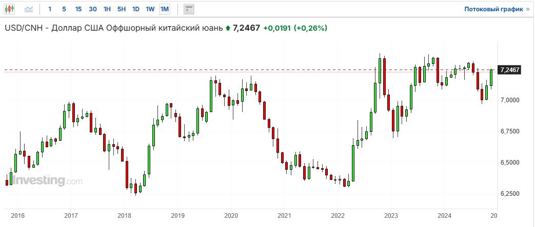 Доллар к юаню уже поднялся до 7.25 (см. внизу месячный график)