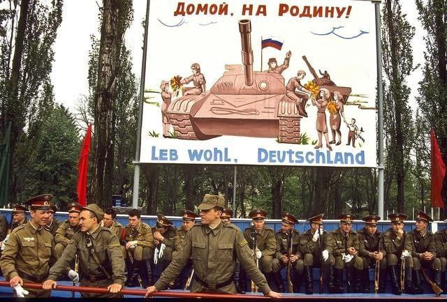 Плакат с надписью «Назад на родину!» на русском языке и «Прощай, Германия» - на немецком, Вюнсдорф, 1994 год.
