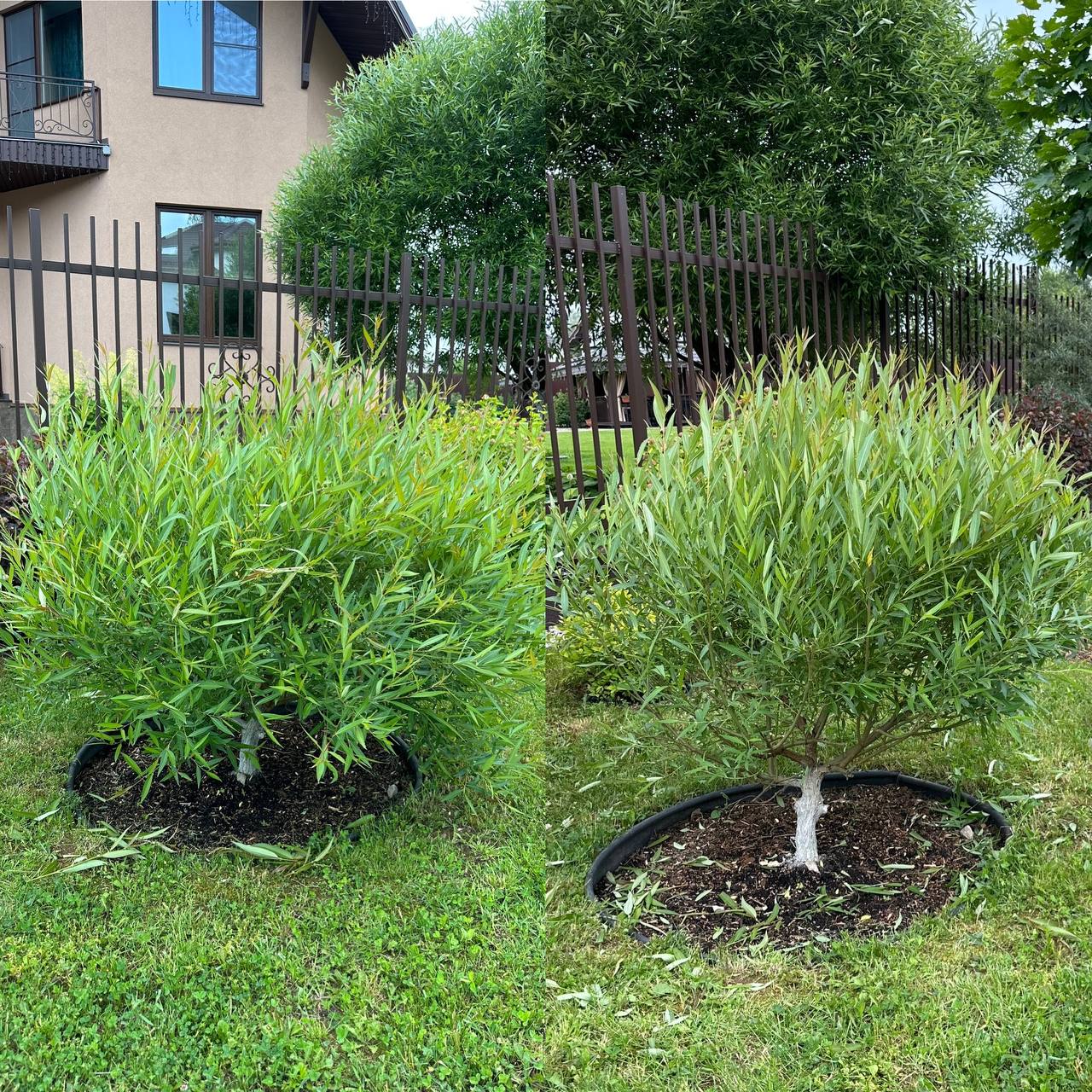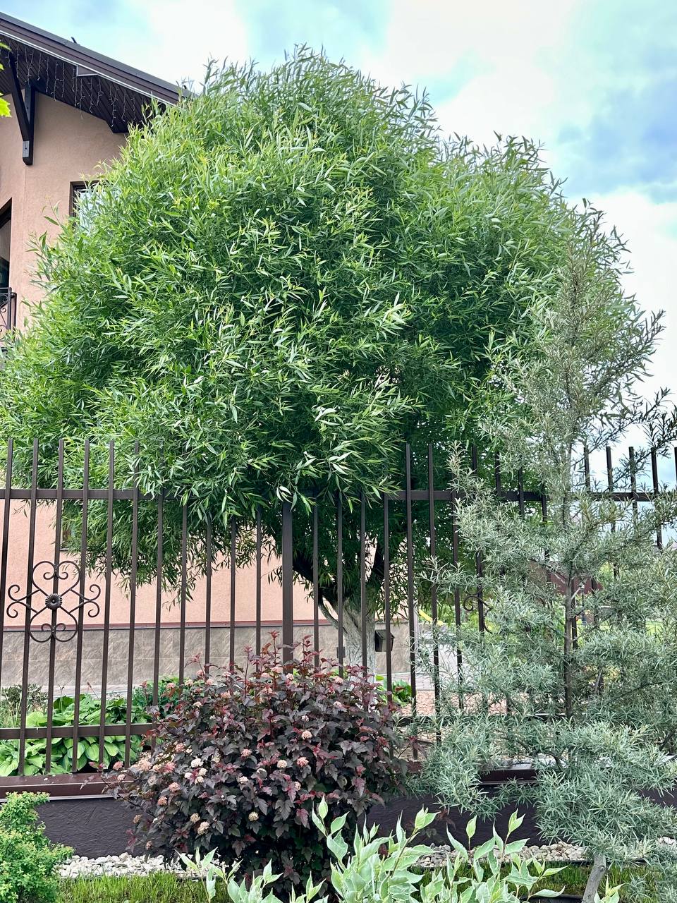 Хорошо знакомая моим друзьям шаровидная Ива, которую я четыре года назад привезла из старого дома в новый по цене трёх дорогих крупномеров).