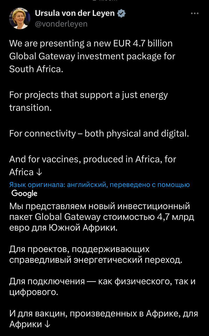 Урсула фон дер Ляйен: представляем новый инвестиционный пакет Global Gateway стоимостью €4,7 млрд для Южной Африки.