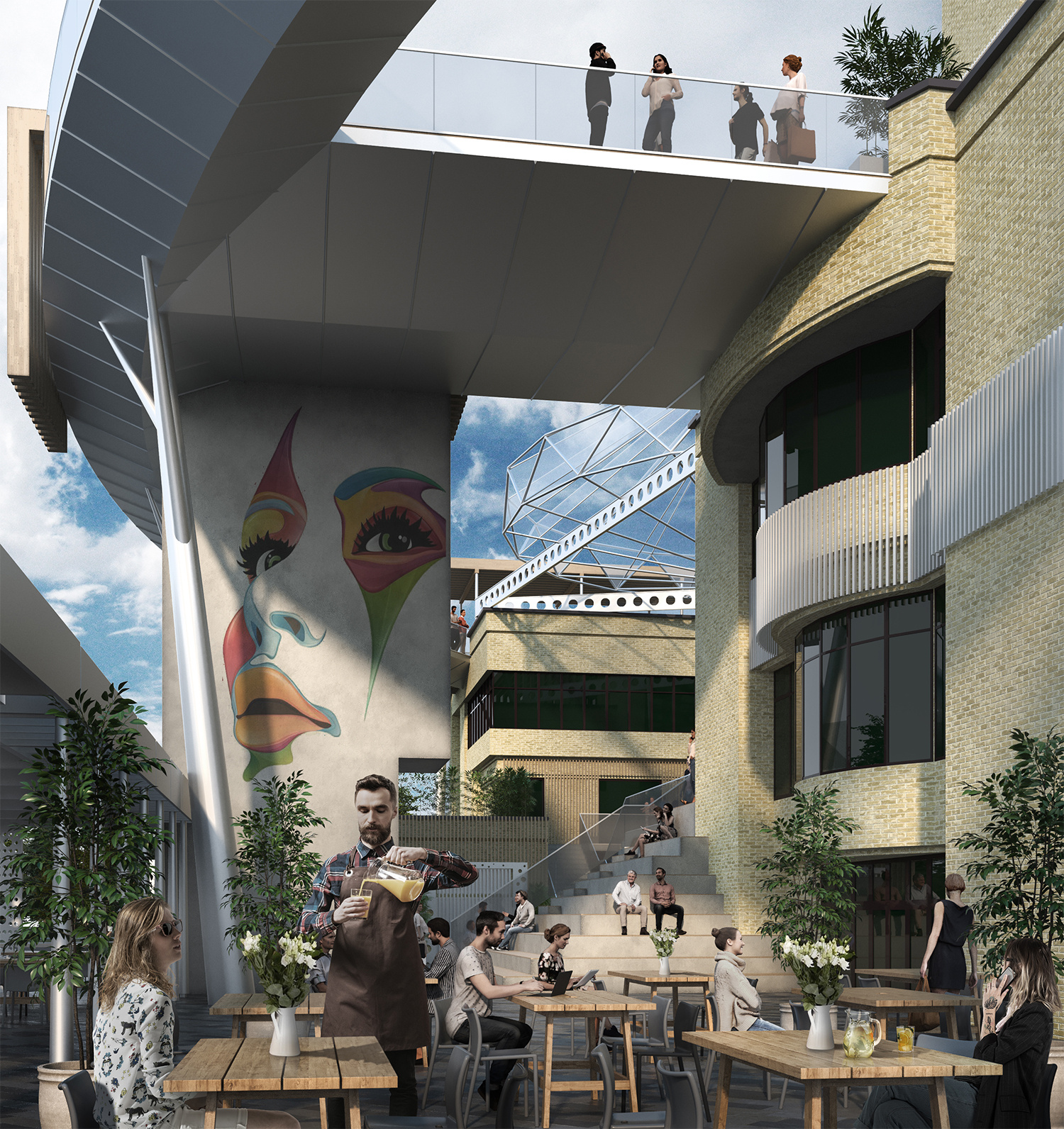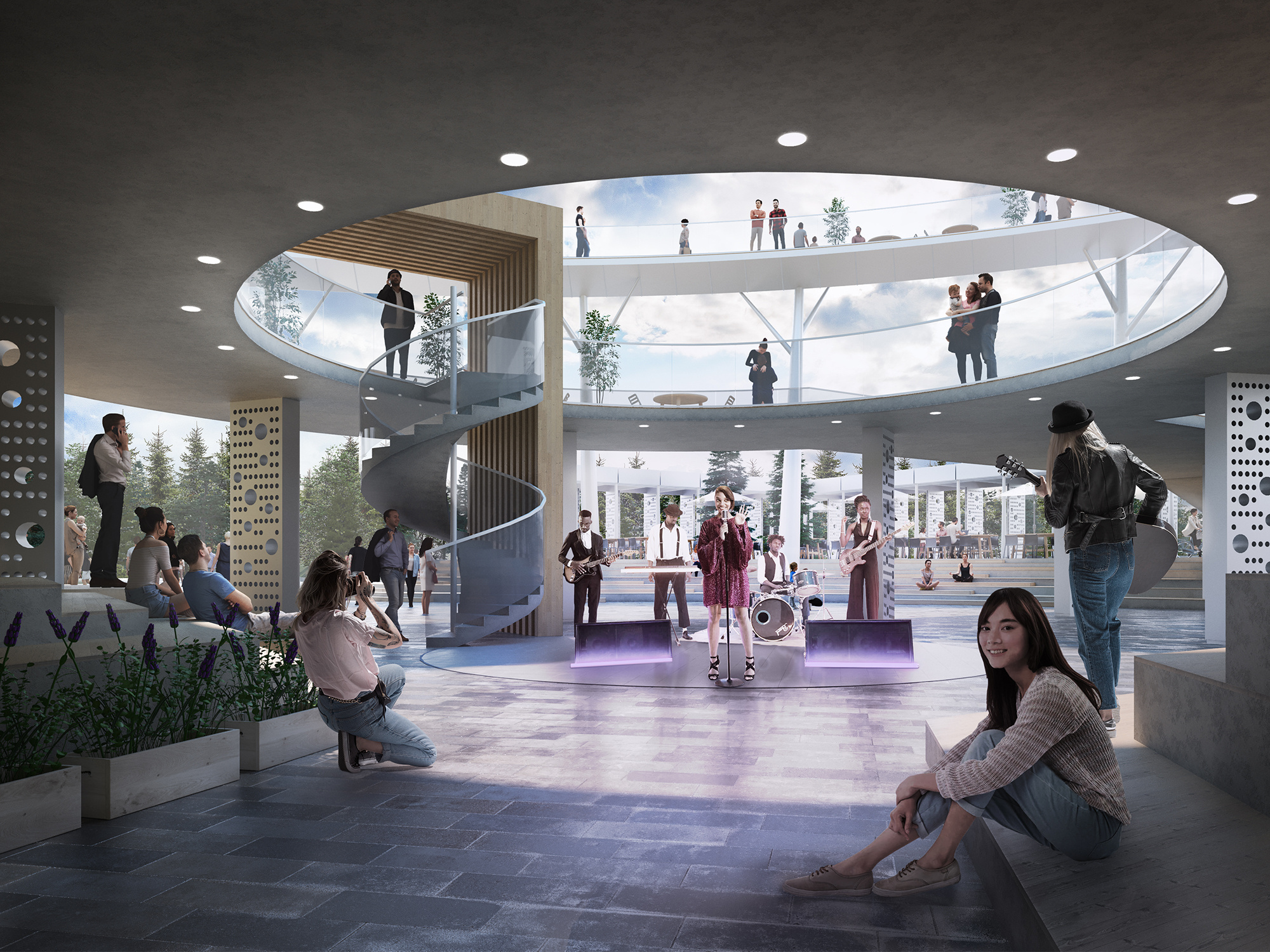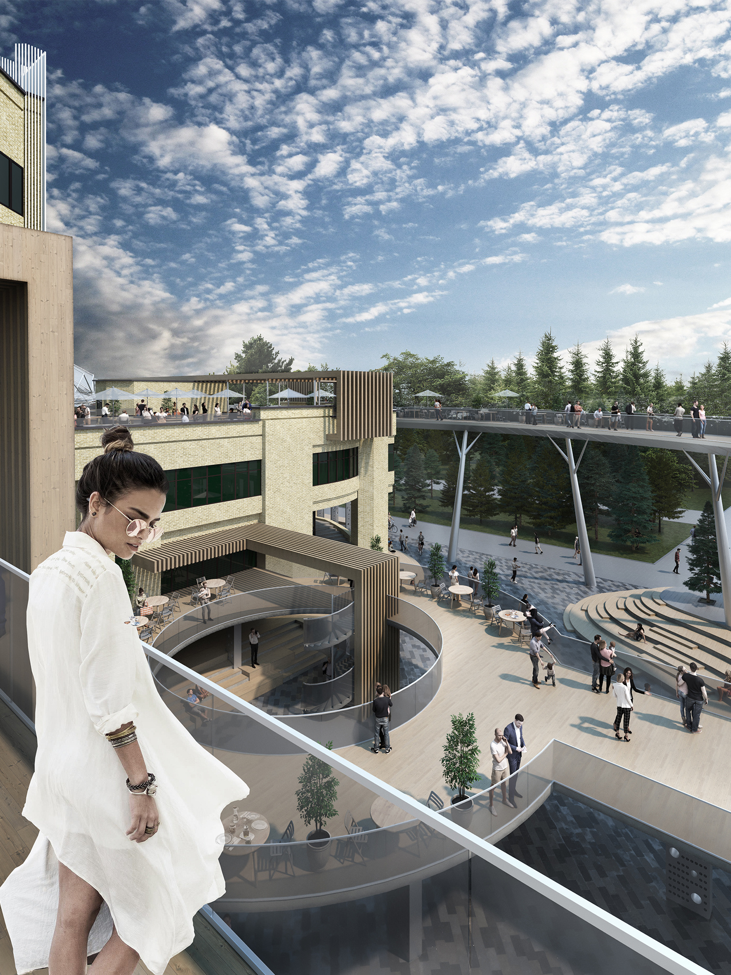 Архитекторы предлагают разместить вокруг здания систему открытых, интегрированных друг в друга, общественных пространств. Главной из этих площадок станет «городская гостиная» с уличным амфитеатром и сценой. У входа в здание зодчие предложили создать деловую площадь с различными местами отдыха.