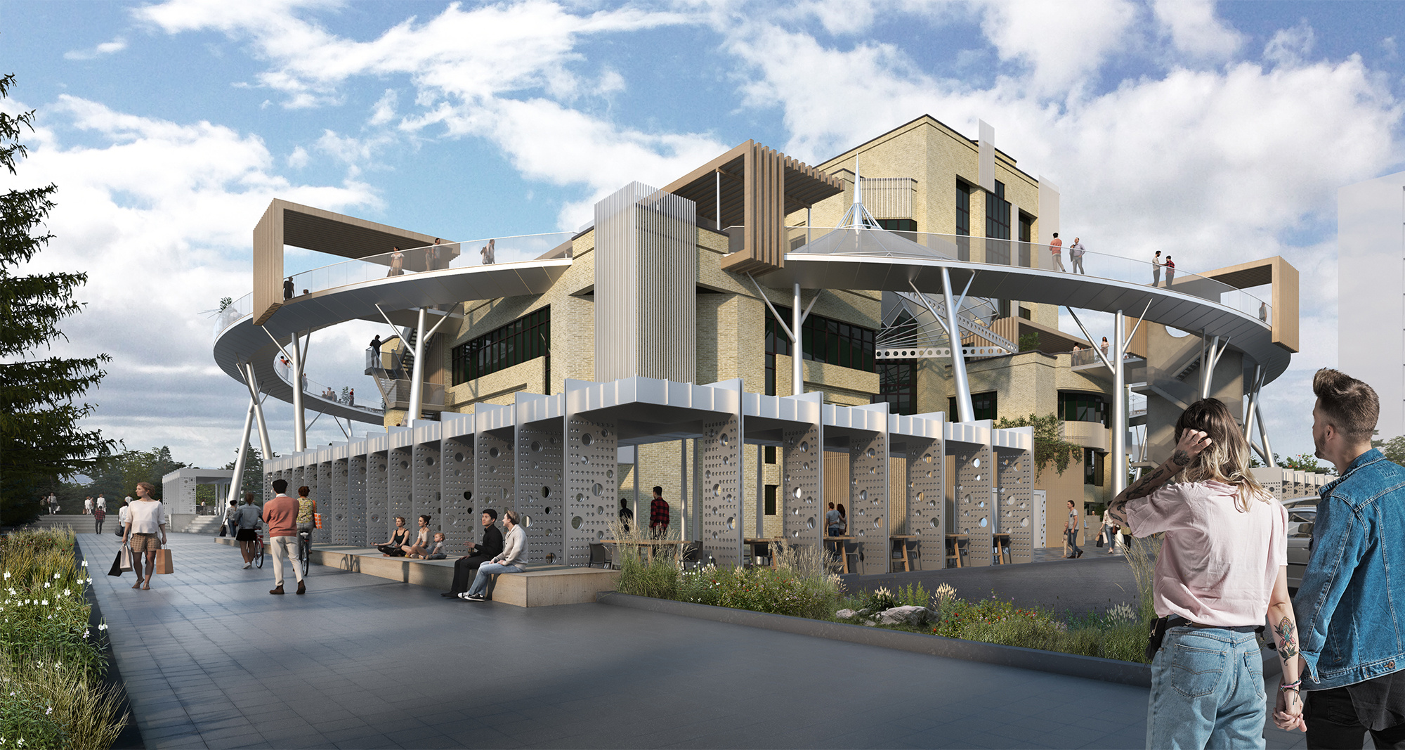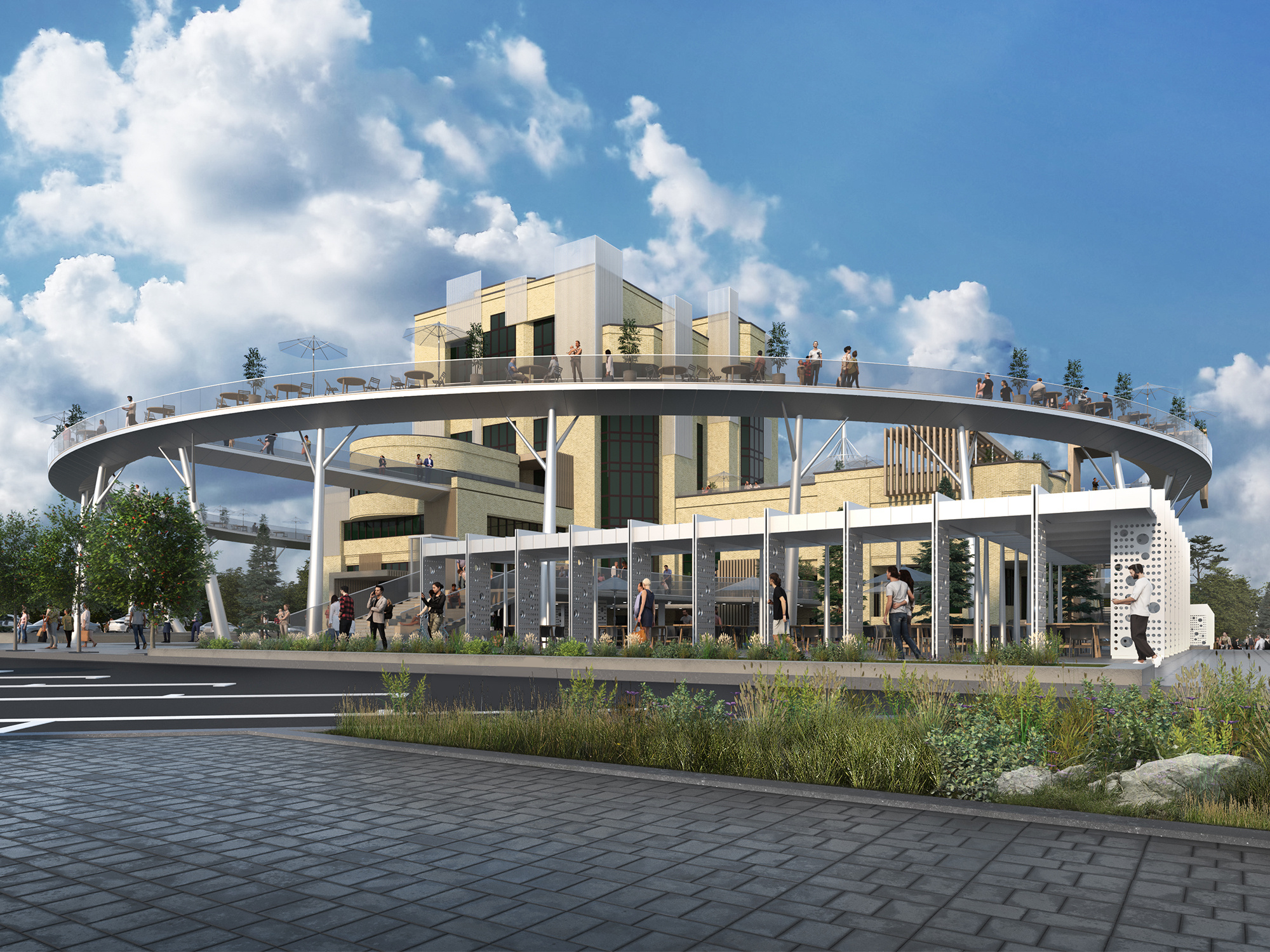 Реализация проекта будет включать пять этапов — проектные работы и технологическую перепланировку здания (на этом этапе заменят входные группы), за этим последует организация новых парковочных мест (придется снизить уровень земли для создания «городской гостиной» и уличного амфитеатра). Вокруг здания также появятся теневые навесы и летние веранды. Кровлю на уровне третьего этажа предполагается перекрыть ажурной конструкцией в виде шатра. Облик нового общественного пространства завершит приподнятая круговая галерея — судя по эскизам, она берет здание в кольцо и позволяет создать открытую зону для прогулок и летнего кафе.