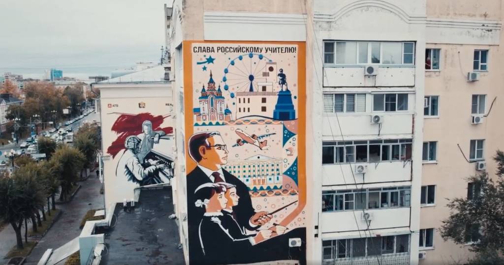 Вот уже неделю жители Хабаровска обсуждают масштабное граффито в центре города, над которым работала команда сообщества "Мой день" в соцсети "ВКонтакте". Местные паблики пестрили видео очевидцев, где запечатлён художник, рисующий мурал на стене одного из домов. Оказалось, что такая огромная композиция приурочена ко Дню учителя, и теперь хабаровчане могут увидеть современную интерпретацию одного из советских плакатов про педагогов.