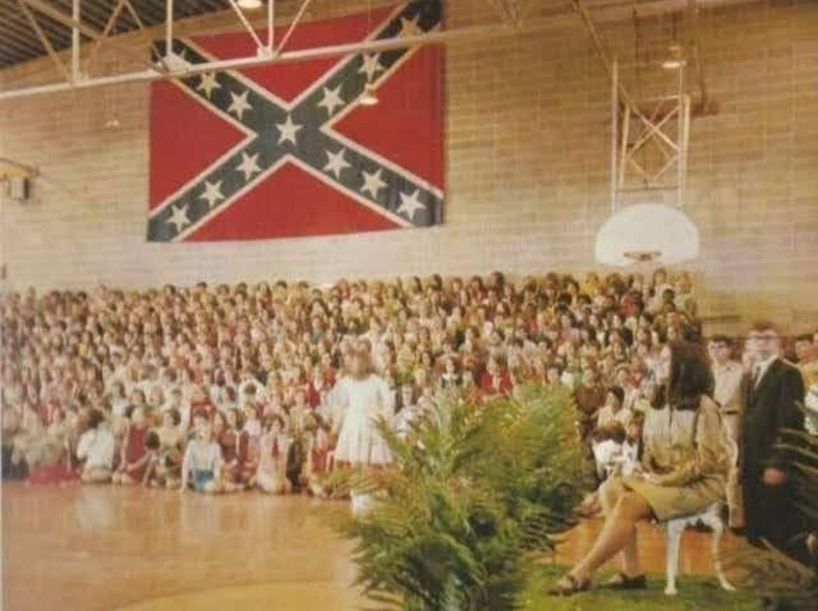 Средняя школа имени генерала-конфедератв Роберта Э. Ли для учеников в возрасте 9-12 лет в Монтгомери, штат Алабама, 1968 год. На одной из стен школы на самом видном месте висела бронзовая табличка, призывавшая мальчиков и девочек не позорить имя великого генерала - ни дурными поступками, ни плохой успеваемостью, и всегда оставаться джентльменами и леди.