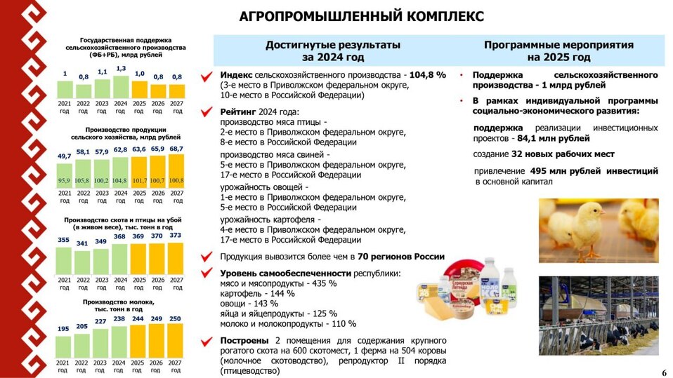 За прошлый год агропромышленный комплекс республики произвел продукции на 63 миллиарда рублей. Рост индекса почти на 5% позволил региону занять по этому показателю десятое место в стране и третье в округе.