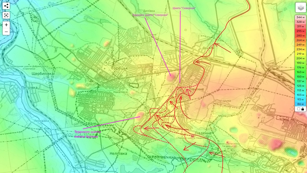 Одновременно с этим идет продвижение и фактически охват позиций противника в районе террикона шахты имени Артема в Зализном (Железном), утеря которого сразу обрушит позиции противника южнее, лишив их подвоза.