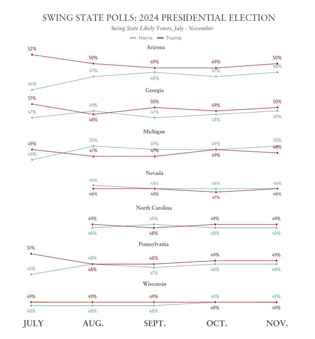 ✔️Итак, завтра выборы президента США: вот что показывают финальные опросы от Emerson College в колеблющихся штатах (где избиратели могут решить исход в ту или иную сторону)
