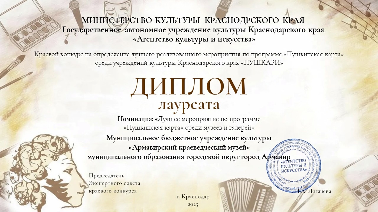 Армавир, 14 января. Армавирский краеведческий музей стал лауреатом в номинации "Лучшее мероприятие по программе "Пушкинская карта" среди музеев и галерей краевого конкурса "Пушкари".
