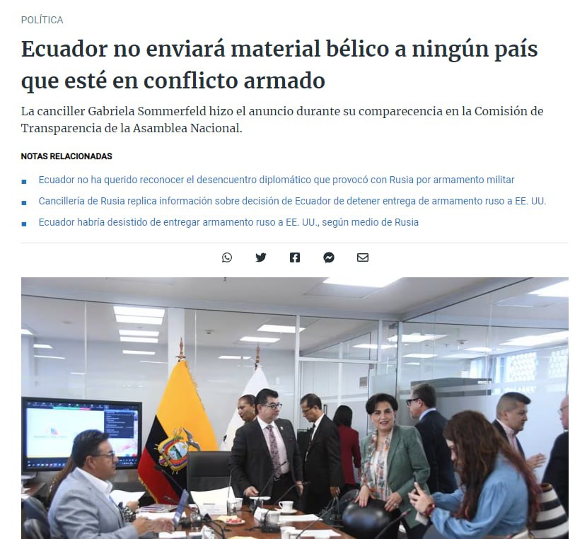 По словам главы МИД Габриэлы Зоммерфельд, президент Эквадора дал указание не посылать никакой военной техники в те страны, которые участвуют в международном вооруженном конфликте.