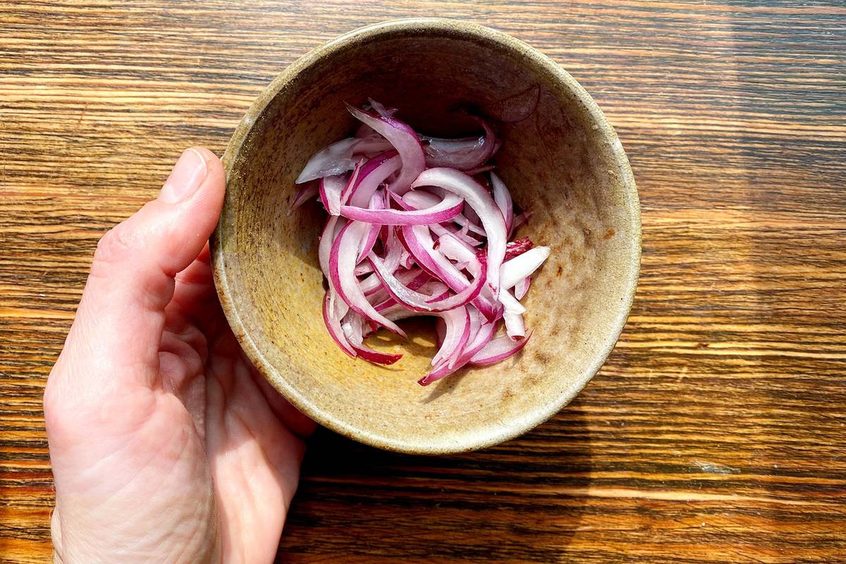 Шаг 2. Красный лук порежьте перьями: от верхушки к корню. Залейте яблочным уксусом, перемешайте и оставьте на 10 минут.