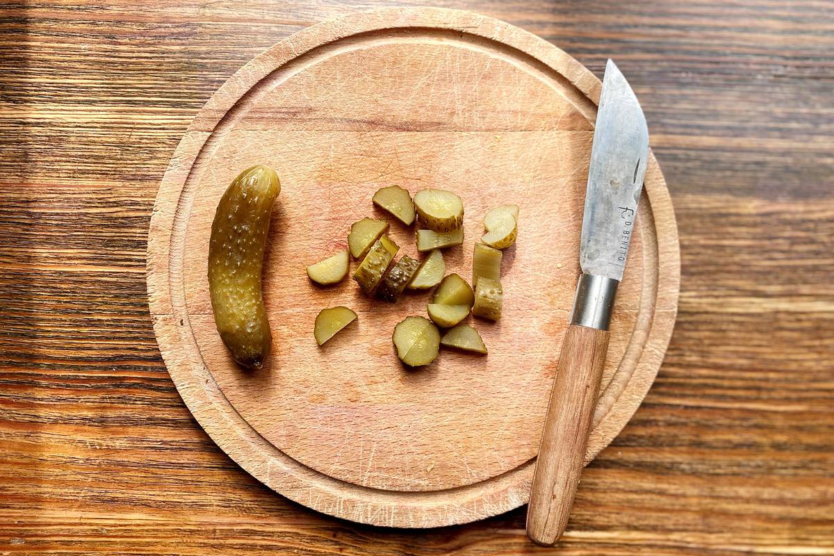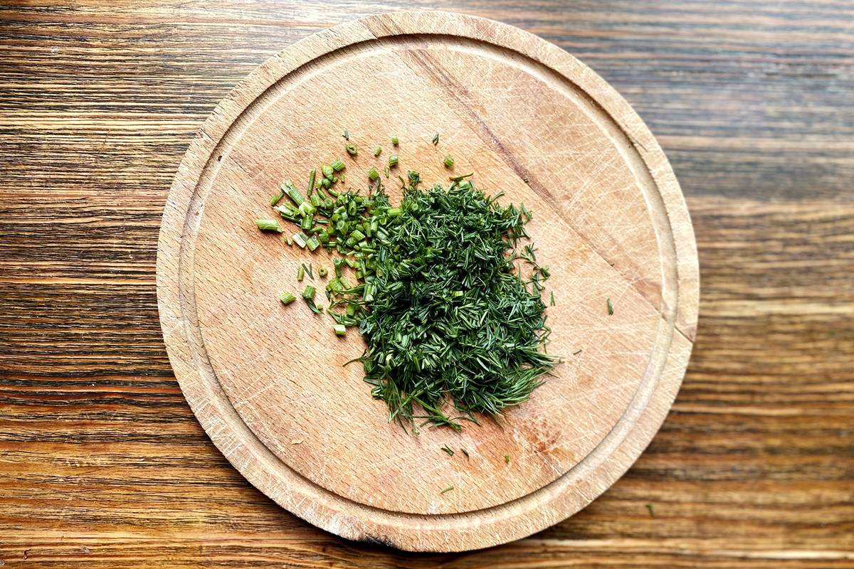 Шаг 4. Корнишоны нарежьте полукольцами. Укроп мелко порубите.