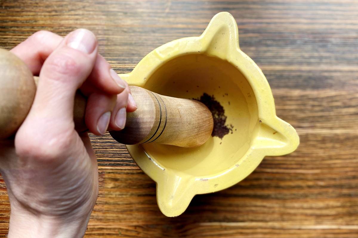 Шаг 5. Приготовьте соус. Зерна горчицы слегка подавите в ступке. Смешайте с остальными ингредиентами: оливковым маслом, медом и горчицей. Добавьте соль и перец.