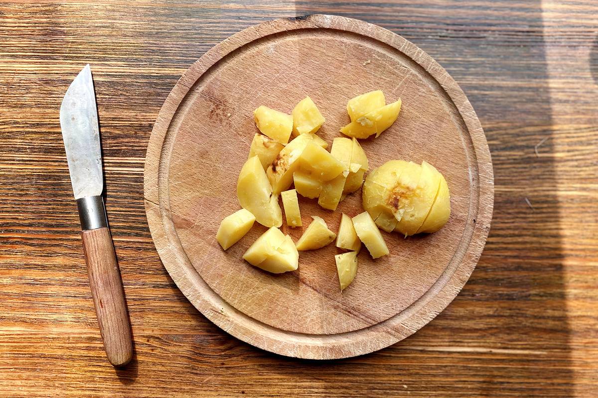 Шаг 3. Готовый картофель слегка остудите и очистите от кожуры. Нарежьте крупными кубиками.