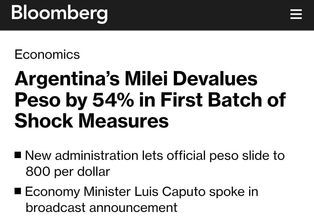 Аргентинский президент Милей пришел с обещанной бензопилой и девальвировал песо на 54% в рамках первого пакета шоковых мер. Его министр экономики Капуто устроил капут песо и обвалил его до 800 за доллар. https://t.me/banksta/45566