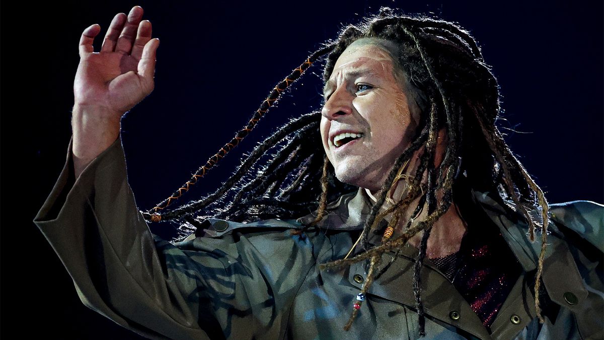 — Алина захотела, чтобы я был таким рассказчиком. Не то Оззи Осборн, не то Охлобыстин. Потом мне присылают схему льда — а там сваи, висят тросы. Шансы на тулуп снижаются. Дальше мне сказали, что я выхожу первым, то есть мышцы холодные. Я еще надеюсь на двойной — сниму плащ, найду траекторию… И мне в конце говорят — еще у вас трость, которая будет иногда стрелять огнем. И вообще твое появление видится по-другому — ты прилетаешь в петле. Вот так прыгнул. Это невозможно, большой риск. Если слетят дреды — будет совсем не смешно.