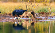 Финляндия, провинция Кайнуу. Медведь наблюдает за вороном, поедающим рыбу в окрестностях деревни Вииксимо муниципалитета Кухмо. Эту сцену запечатлел фотограф-натуралист Валттери Мулкахаинен.