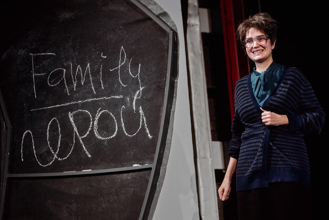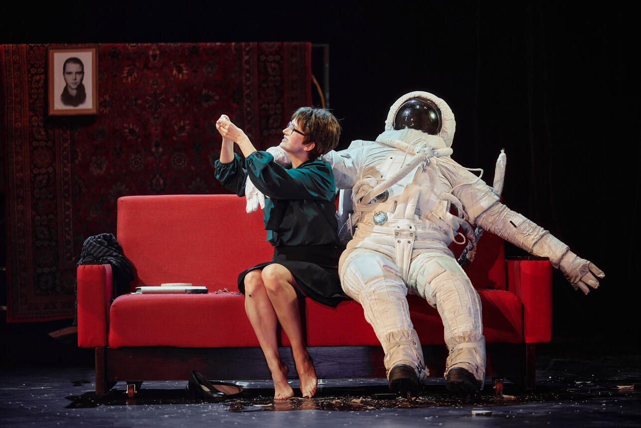 Пьесу «Космос» Алексея Житковского, театры трактуют по-разному. В версии театра им. Пушкина получилась классная комедия. Ну как, комедия... В высоком смысле: когда мы смеемся, чтобы не сойти с ума. Именно поэтому главную героиню играет Виктория Исакова, которая всегда держит планку истинно драматической актрисы. Ее учительница английского в провинциальной школе, с одной стороны, достоверна, похожа на тысячи «англичанок» с их старанием, требованиями, с другой — она совершенно точно проживает какой-то черновик своей жизни, что ли. И это видно по всему: героиня преподает стандартные школьные тексты по англ. яз., а сама едва ли не каждый вечер смотрит любимый фильм «9,5 недель» (конечно, на языке оригинала) — и Микки Рурк появляется в ее скромном жилище, с ним она разговаривает, как с близким ей человеком («Ай`м нот Микки, ай`м Джонни. Энд ай вонт ё борщ»). Так-то она была когда-то замужем, однако сына растила одна, потому что муж погиб. Она прилежно ходит на его могилу, как все вдовы в их городке, но испытывает при этом смешанные чувства: с одной стороны, портрету можно безопасно пожаловаться, что сын растет бестолковый (зис изн`т тру), с другой — она долго никому не говорила, что испытывает облегчение от смерти мужа, который ее бил... И вообще, если бы он не затащил ее в загс, ее жизнь, как она думает, сложилась бы совсем по-другому. И вот теперь Татьяне Викторовне кажется, что космонавт Сергей, с которым она в юности сидела за одной партой (и он подарил ей полкарандаша, она сохранила!), едет именно к ней. За ней. В школе суматоха, готовится торжественная встреча...
