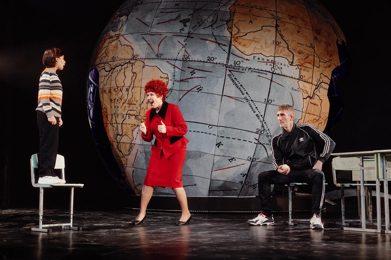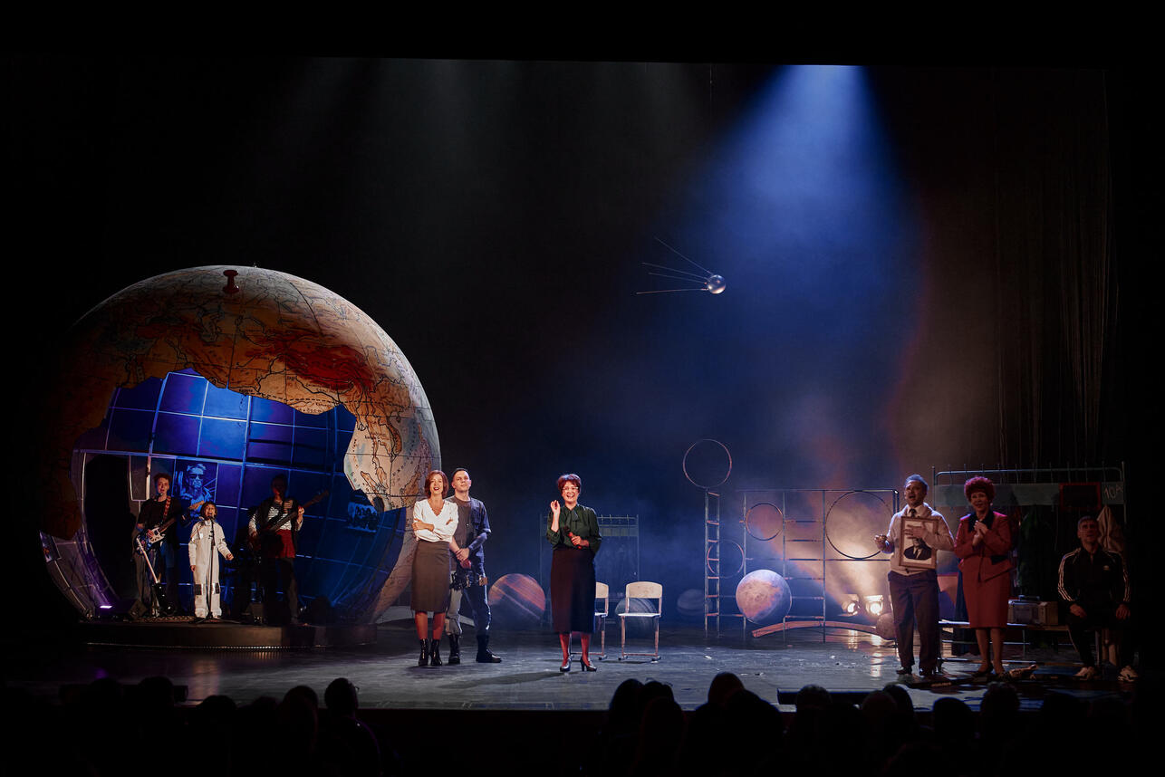 На сцене — огромный земной шар, местами с разломами (благодаря чему внутри играет местная группа, исполняющая всё — от рока до рэпа). Но и на фоне глобуса провинциальный городок продолжает себе жить-поживать, как обычно. Ну в самом деле, мы же, несмотря на астрологов, не соразмеряем каждый свой поступок с космосом! Нет, космическая пыль озаряет (осеняет?) нас лишь иногда, внезапно — и только тогда можно заметить, достойно ли проходит жизнь и на что ты ее разменял.
