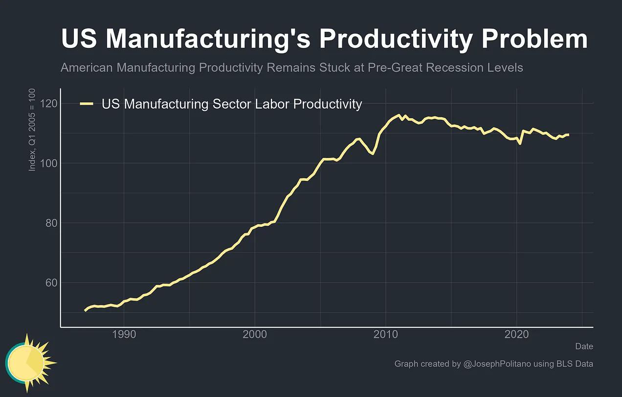 У американской промышленности не наблюдается роста производительности уже 17 лет. Это делает для США все более невозможной конкуренцию в ключевых областях с Китаем.