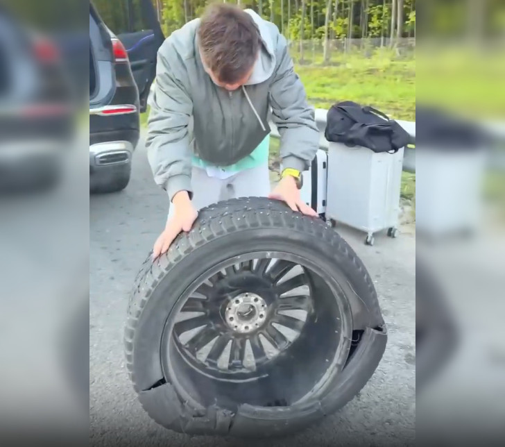 Как выяснилось, на Mercedes исполнителя была установлена зимняя резина, хотя сейчас уже летний сезон. После замены колеса артист благополучно продолжил путь. Судя по видео, пострадал и бампер автомобиля. От колеса же остались только ошметки.