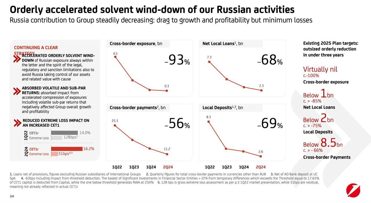 UniCredit идет к закрытию российского бизнеса семимильными шагами. С 2020 года кредитный портфель снизился на 68% до 2,3 млрд евро, объём международных переводов сократился на 56% до 11,2 млрд евро, депозиты на 69% до 2,6 млрд евро. @banksta