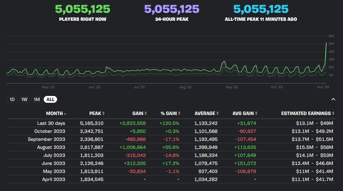 Онлайн в Fortnite резко увеличился с выходом нового сезона. Сначала в игре одновременно находилось около 3,9 млн человек, однако к концу дня показатель вырос до рекордных значений. При этом из 5 млн человек 2,8 млн предпочитают играть именно в режим «Королевская битва».