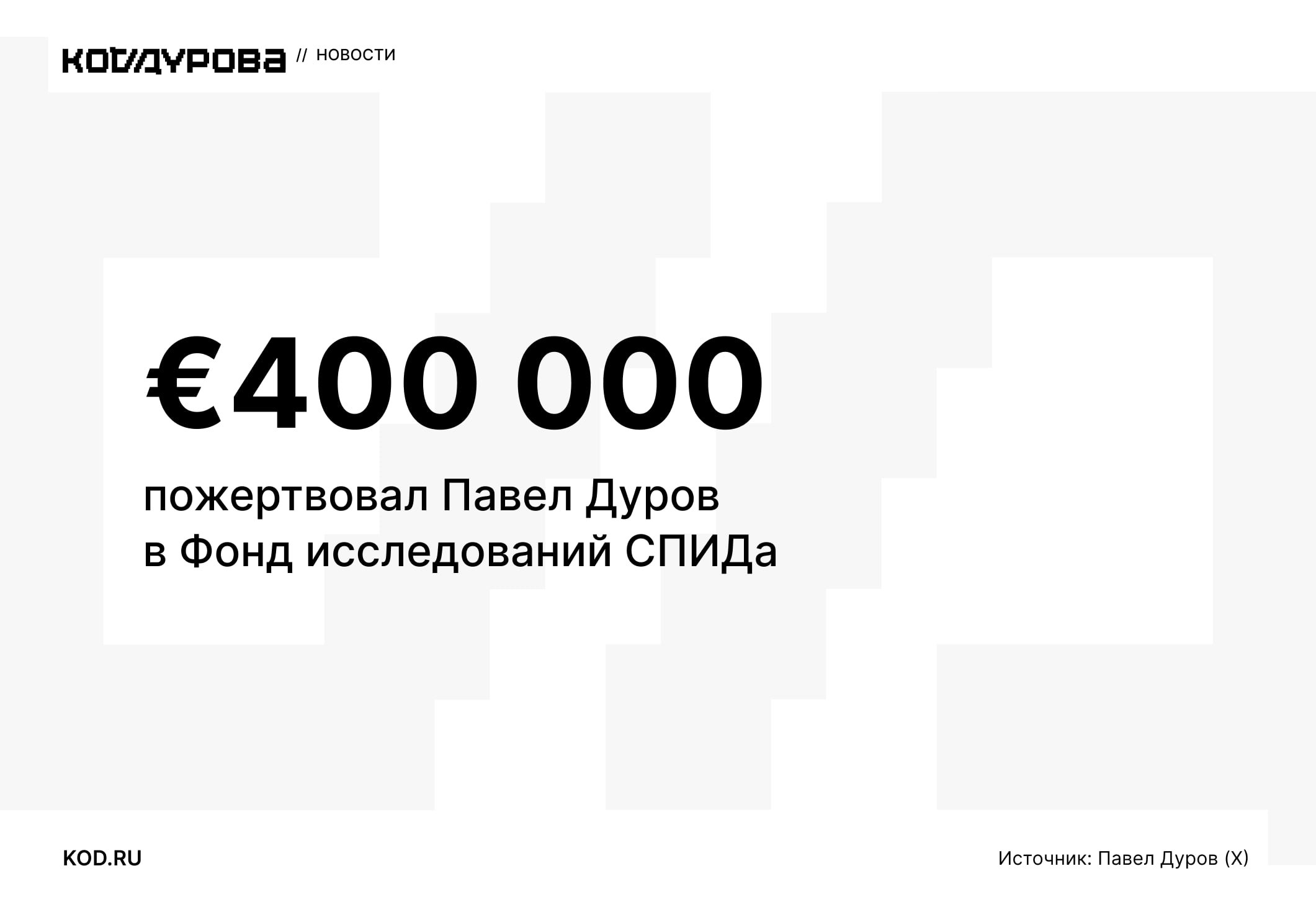 Павел Дуров пожертвовал 400 000 евро (~36,3 млн рублей) в Фонд исследований СПИДа (amfAR). Ранее он со своей спутницей Юлией Вавиловой посетил благотворительный гала-вечер в рамках Каннского кинофестиваля.