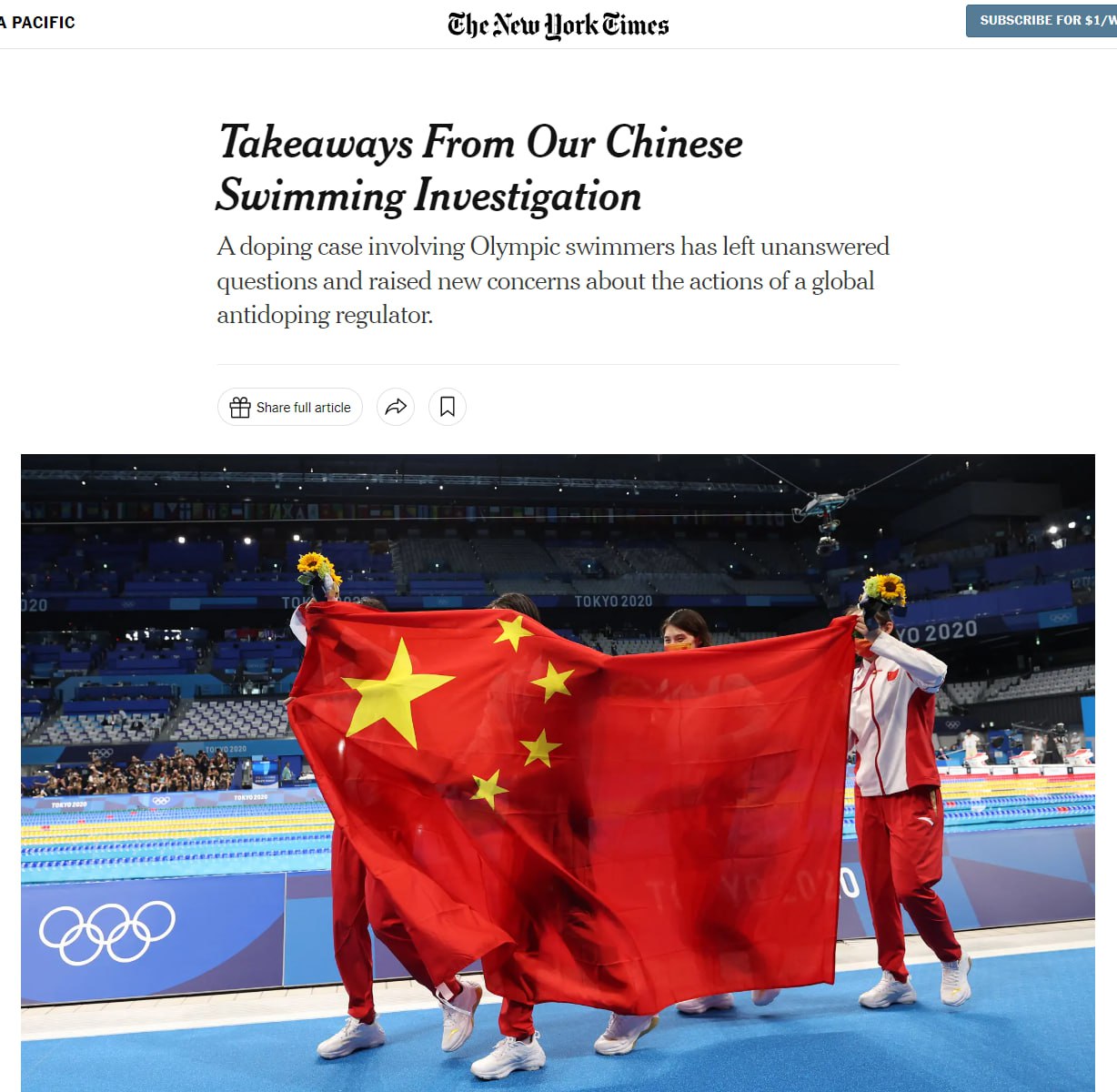 В субботу газета The New York Times опубликовала материал, в котором утверждалось, что у 23 китайских пловцов были обнаружены положительные допинг‑пробы.