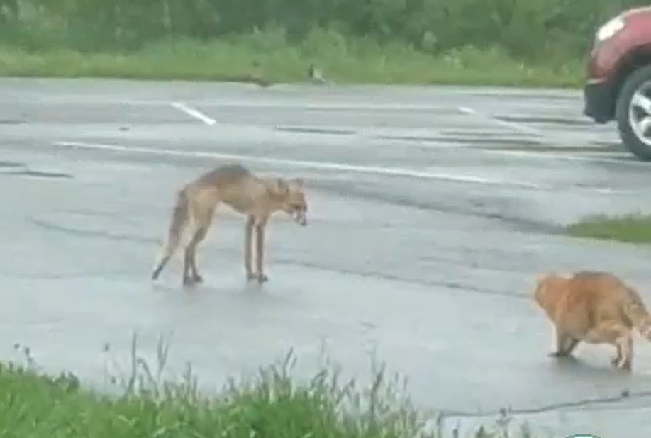 На кадрах видно дикое животное, рядом с которым стоит кот. Автор, предположил, что увидел лисенка, а также голосом попытался прогнать зверя.