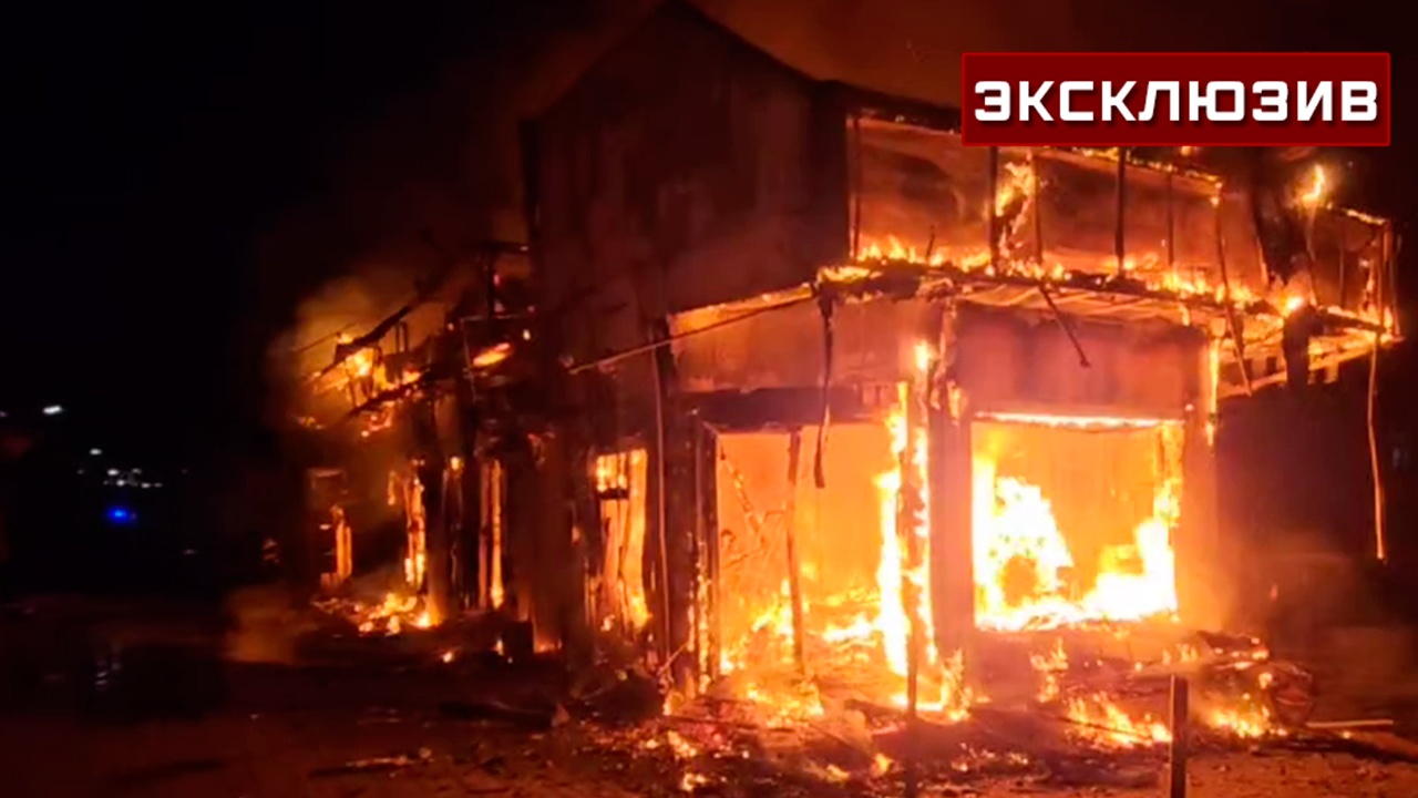 В результате атаки загорелись торговые ряды в Ворошиловском районе. На место прибыли пожарные, сейчас они продолжают бороться с огнем. На опубликованных кадрах специалисты тушат горящие здания.