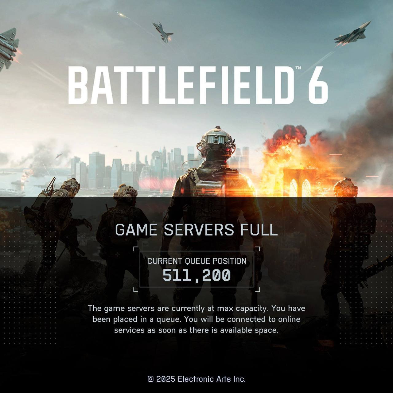Как и во время старта беты, серверы BF6 не выдерживают наплыва игроков и отправляют их в очередь. На момент публикации новости сообщают о 500+ тысячах игроков в очереди, чтобы поиграть в Battlefield 6.