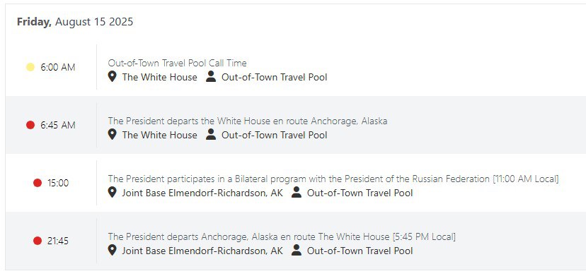 А точнее – не более 6 часов и 45 минут. Согласно графику президента США, который опубликовал Белый дом, переговоры начнутся в 22:00 по московскому времени, а уже в 04:45 субботы республиканец покинет Аляску и вылетит в Вашингтон.