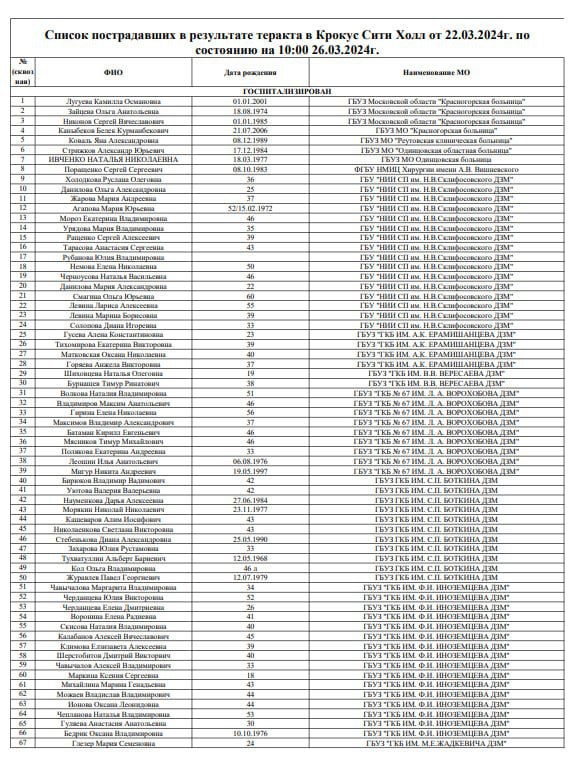 ❗️В больницах по состоянию на 10 утра остается 91 пострадавший в результате теракта в "Крокусе". Минздрав Подмосковья обновил соответствующие списки.