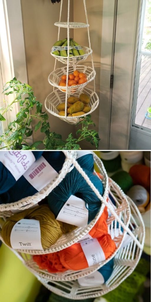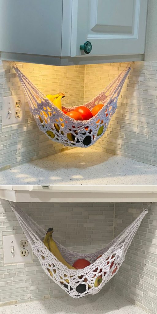 Как вам идея хранить фрукты в вязанном гамаке? Это выглядит так мило! При этом фруктам будет достаточно воздуха, чтобы они дольше оставались свежими, а такой кухонный аксессуар будет привлекать взгляды.