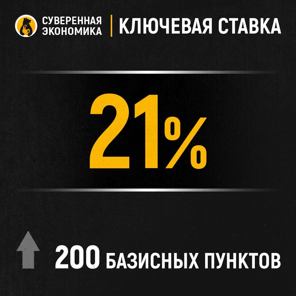 ⚡️ЦБ повысил ключевую ставку до 21% Банк России, как и ожидалось, продолжил курс на ужесточение ДКП. Многие прогнозировали повышение сразу до 21%, хотя консенсус был ближе к 20%. Принципиально сути дела это не меняет, оптимизма такая ситуация точно не добавляет. Регулятор все еще хочет додавить инфляцию любой ценой, несмотря на то, что «ключ» как инструмент уже не так эффективен, а бизнес стонет под гнетом высоких ставок. Два мира в российской экономике никуда не делись.