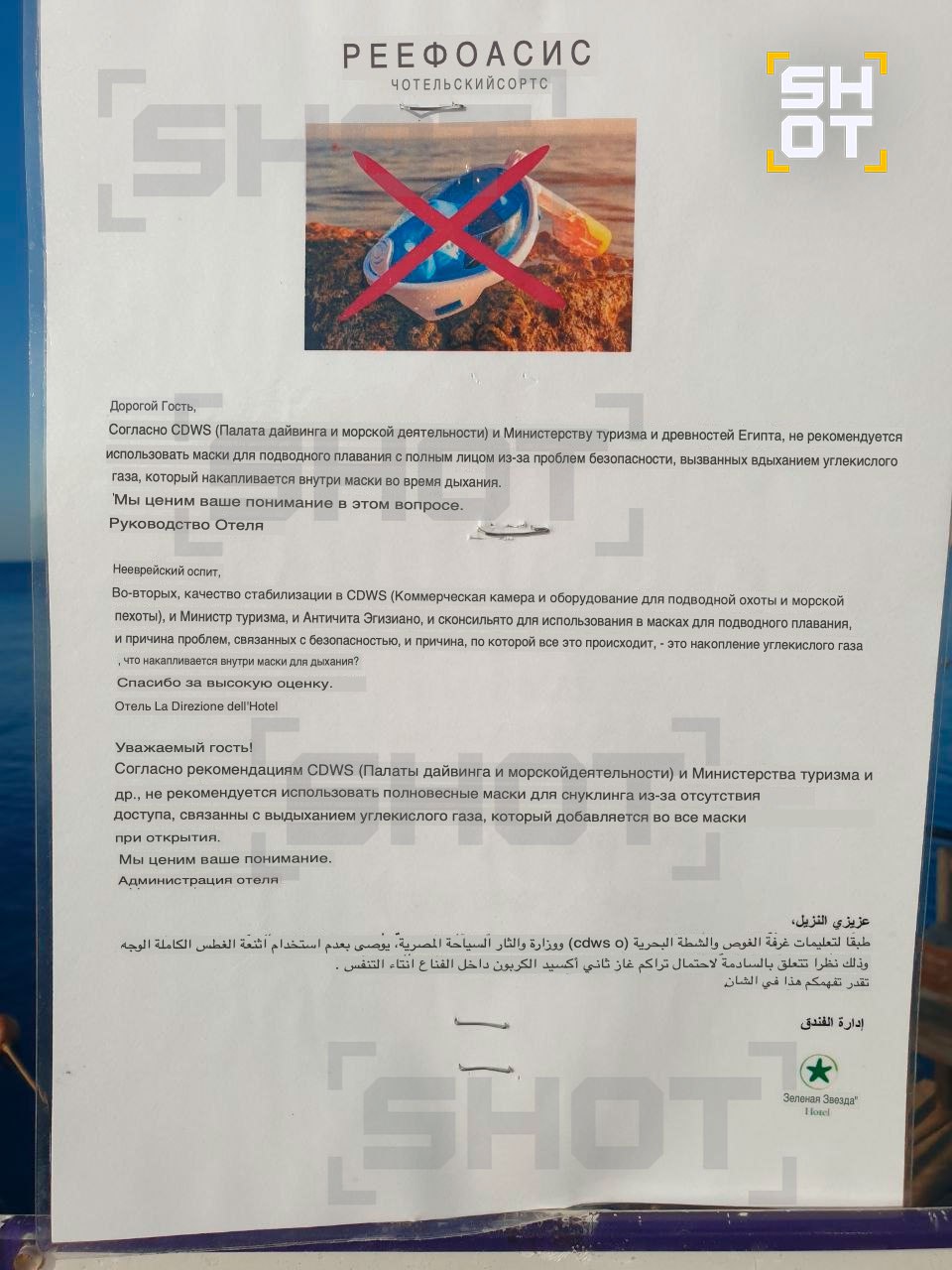 По данным SHOT, речь о популярных полнолицевых масках, которые туристы привозят с собой или покупают в Египте, Турции, Таиланде и т.д, чтобы понырять и посмотреть рыбок. Особую опасность, по словам экспертов, представляют варианты стоимостью до 1000 рублей. В них трудно дышать, протекает вода, а из-за неправильного выхода воздуха запотевает маска, можно надышаться углекислым газом и вырубиться прямо в море. Предупреждения уже массово расклеили в отелях Египта.