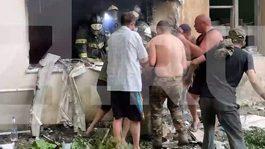 На кадрах, которые запечатлел журналист, видно, как местные жители вместе со спасателями достают из горящего помещения раненую женщину. Характер ее травм уточняется. Также пока не известно, есть ли другие пострадавшие.
