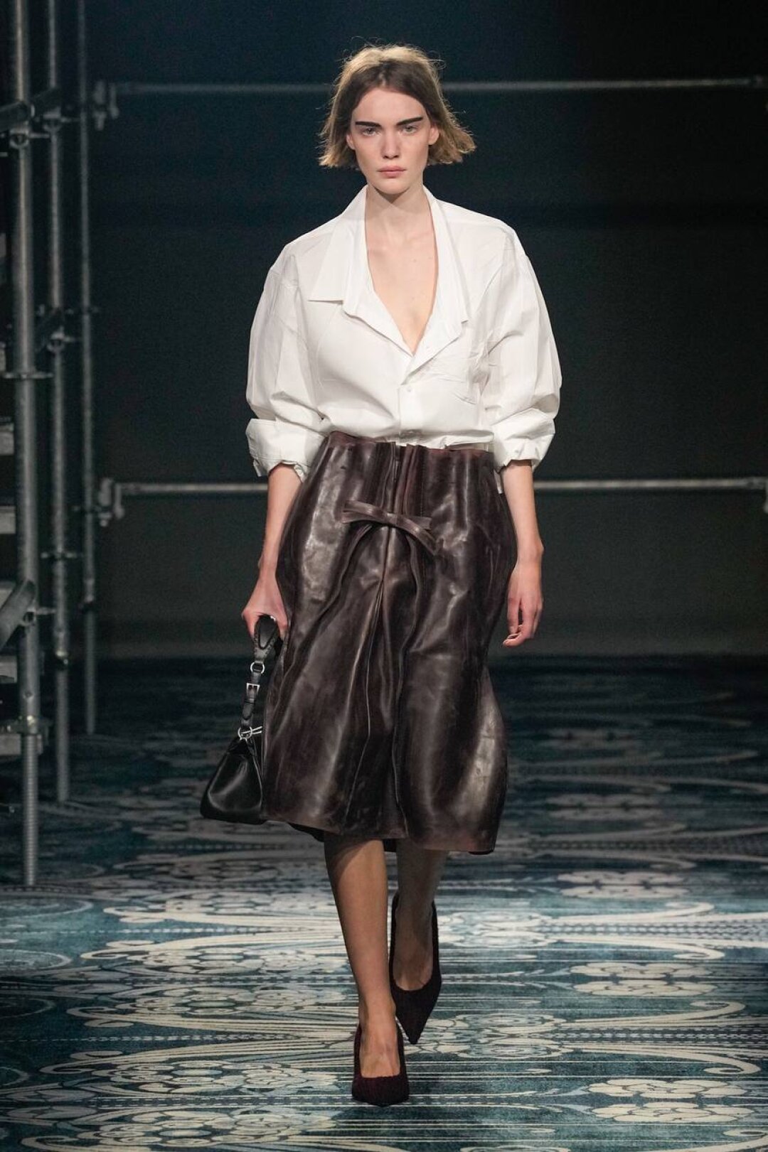 Из мужской коллекции в женскую перекочевали первобытные шкуры и побрякивающий декор на джемперах в виде цепочек и подвесок. Судя по показам сезона FW'25, без кожи не обойтись: у Prada присматриваемся к помятым (новый тренд!) двойкам с объемными жакетами и расклешенным юбкам со сборкой на талии. Продолжаем носить вещи-гибриды и пополняем коллекцию мини-юбками с поясом от костюмных брюк, мутантами шуб и жакетов (с имитацией мехового воротника!), сапогами peep-toe (до ближайшей лужи!) и туфлями с акульими плавниками.