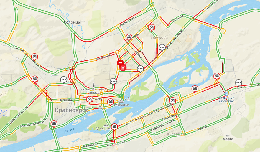 Улица Маерчака на карте обозначена уже не красным цветом, а бордовым — красноярцы терпеливо и медленно едут домой.