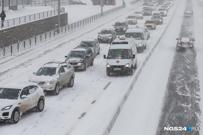 Красноярские водители встали в 9-балльные пробки из-за снегопада