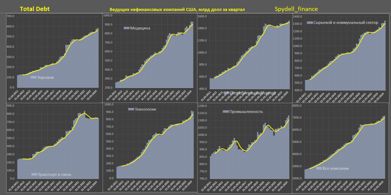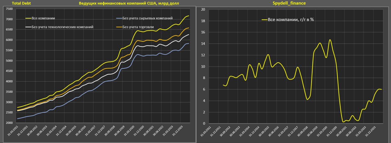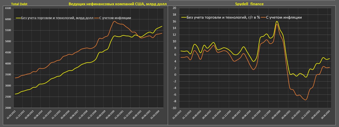 Темп рост долга ускорился до 6% за год по нефинансовым компаниям США, которые предоставили отчетность за 2кв24 и торгуются с 2011 года (по собственным расчетам на основе публичной отчетности).