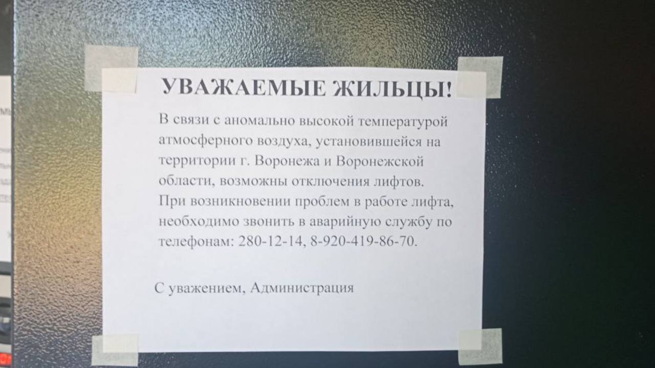 Из-за 40-градусного пекла могут отключить лифты в 9-этажках ЖК «Задонье парк» на улице Выборгской. Соответствующее объявление появилось на домах утром четверга, 10 июля.
