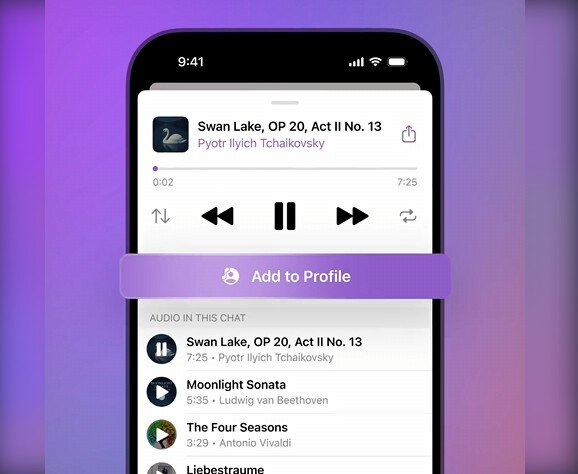 Мессенджер Telegram выпустил обновление, которое теперь позволяет пользователям добавлять музыку в свой профиль из плеера. После этого автоматически создается плейлист, который включает предыдущие песни.