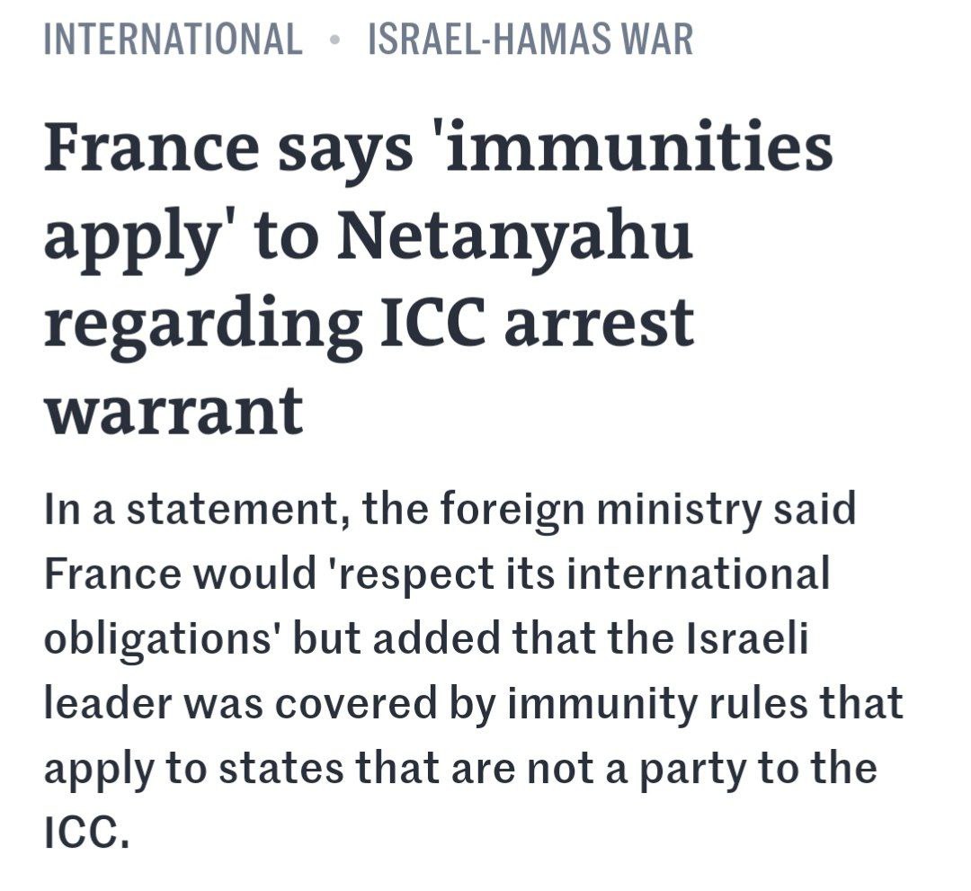Франция отказалась исполнять решение Международного уголовного суда. Министерство иностранных дел Франции заявило об иммунитете премьер-министра Израиля Биньямина Нетаньяху, так как Израиль не участник этого международного суда. Россия, кстати, тоже.