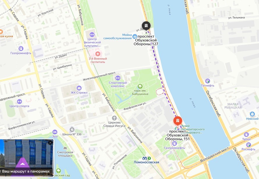Речь идёт о двухъярусной каменной набережной с мощными гранитными спусками, двумя длинными пандусами, террасой и пристанью, которая находится между домами № 127 и 151 на проспекте Обуховской Обороны и была построена в 1926-1928 годах.