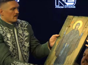 После завершения монологов спикеров и перед тем, как боксёры встретились лицом к лицу в «битве взглядов», Усик получил уникальный подарок — икону Божьей Матери, которую ему передали в знак благодарности за помощь и участие украинские воины, продолжающие отбивать Украину от нашествия российской орды.